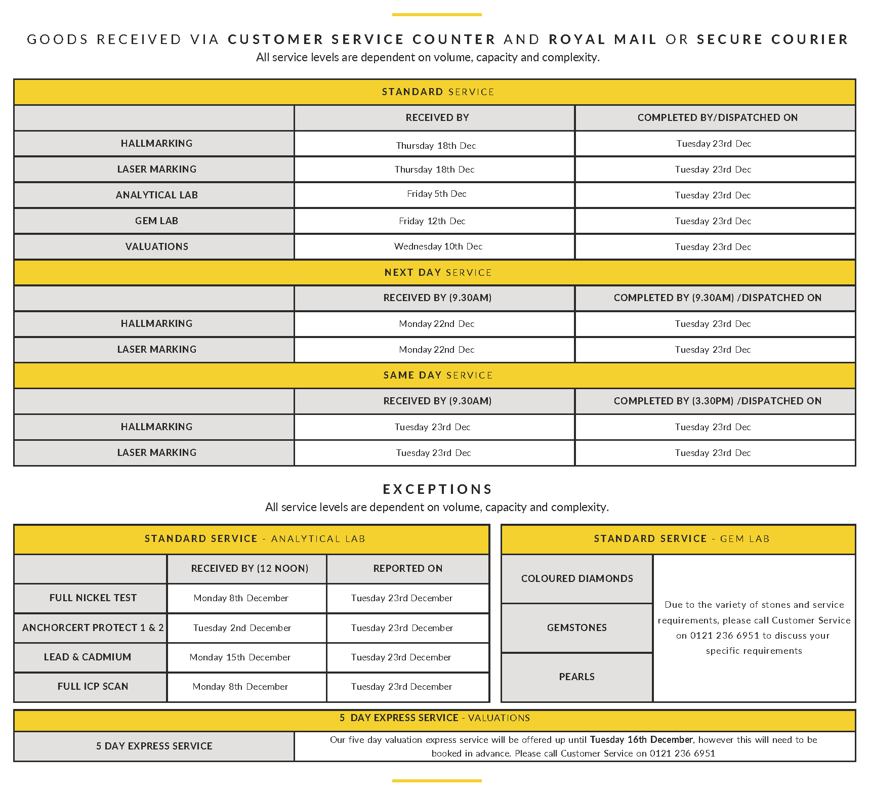 Our 1-hour Hallmarking Express Service will still be available up to 2pm on Tuesday 23rd December 2025 (subject to articles and volumes received).